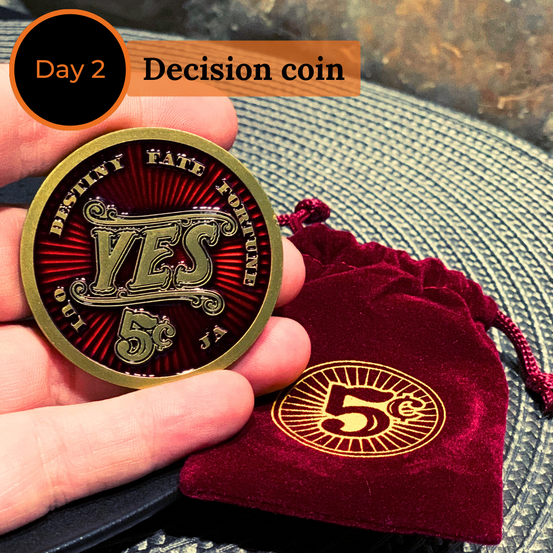 Madam Clara's exclusive Yes/No fortune coin will make all your life decisions from here on out. You're welcome. This handmade 2" diameter coin is diecast in an antiqued zinc alloy metal with soft enamel color.