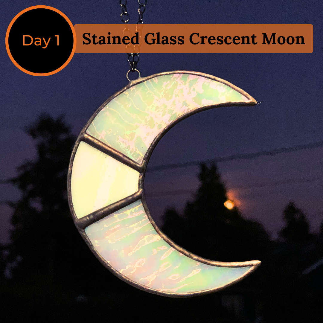 This three-piece crescent moon suncatcher is a perfect touch to any Halloween morning or night. Each piece is handmade of flat and textured iridescent opal colored glass.