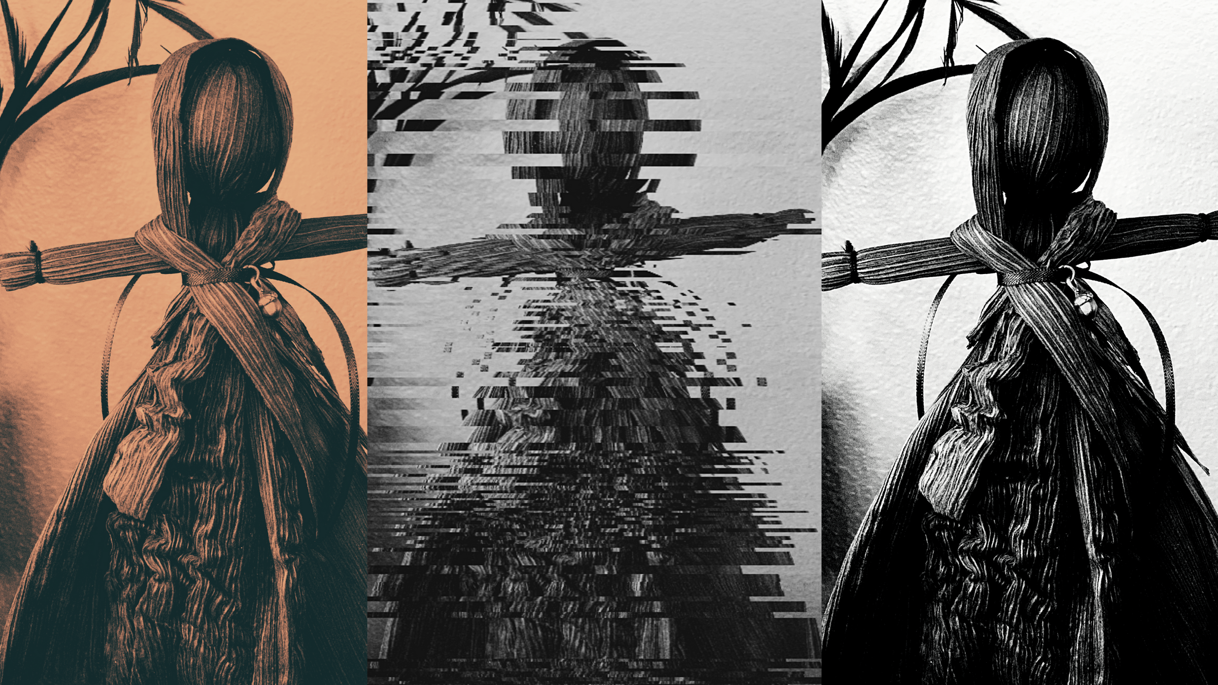 The stuff of beauty and nightmares, this corn husk doll is one-of-a-kind, made with corn husks stained in gues of grey and greens and arranged by hand. Feature this doll in any home decor, altar, or hearth.
